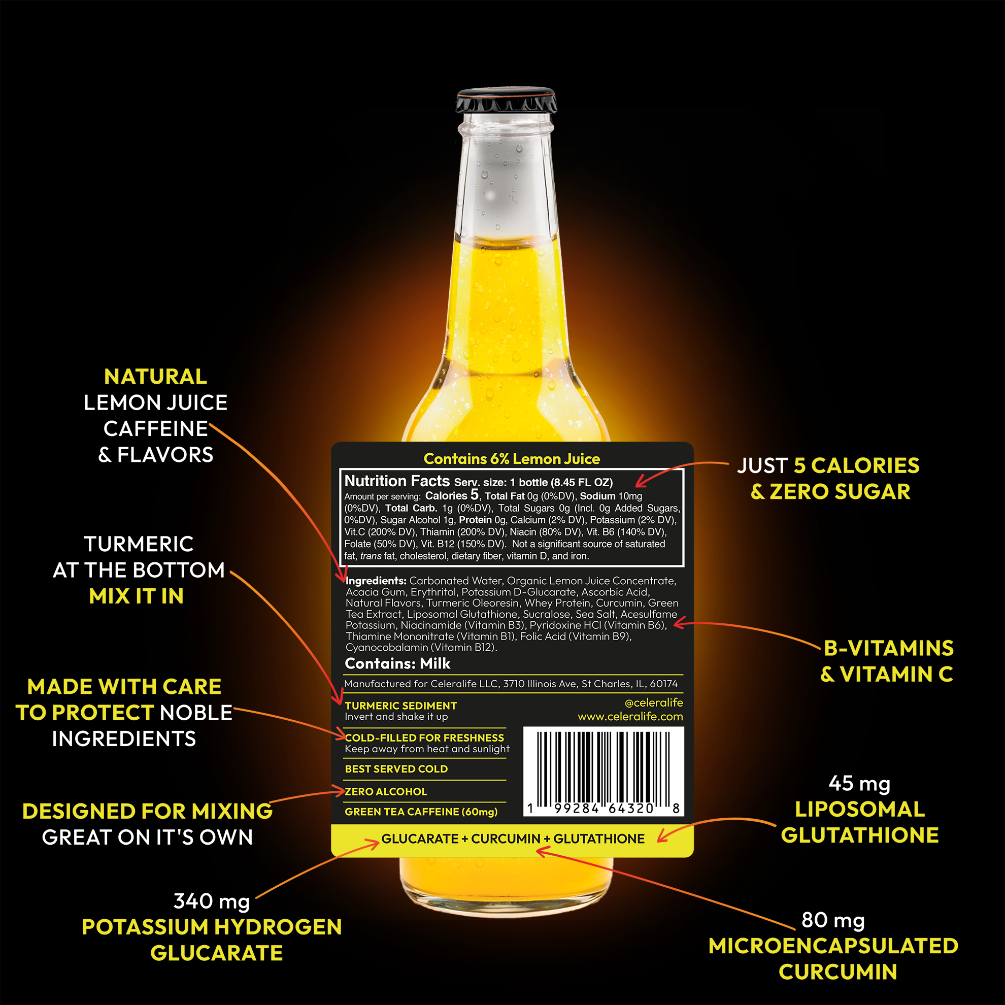 250 mL of lemon juice base blended with curcumin, glutathione, glucarate, vitamin C, B vitamins, and green tea caffeine. Made for your nights out. You’ll get it once you try it. KEEP THE FIRE.